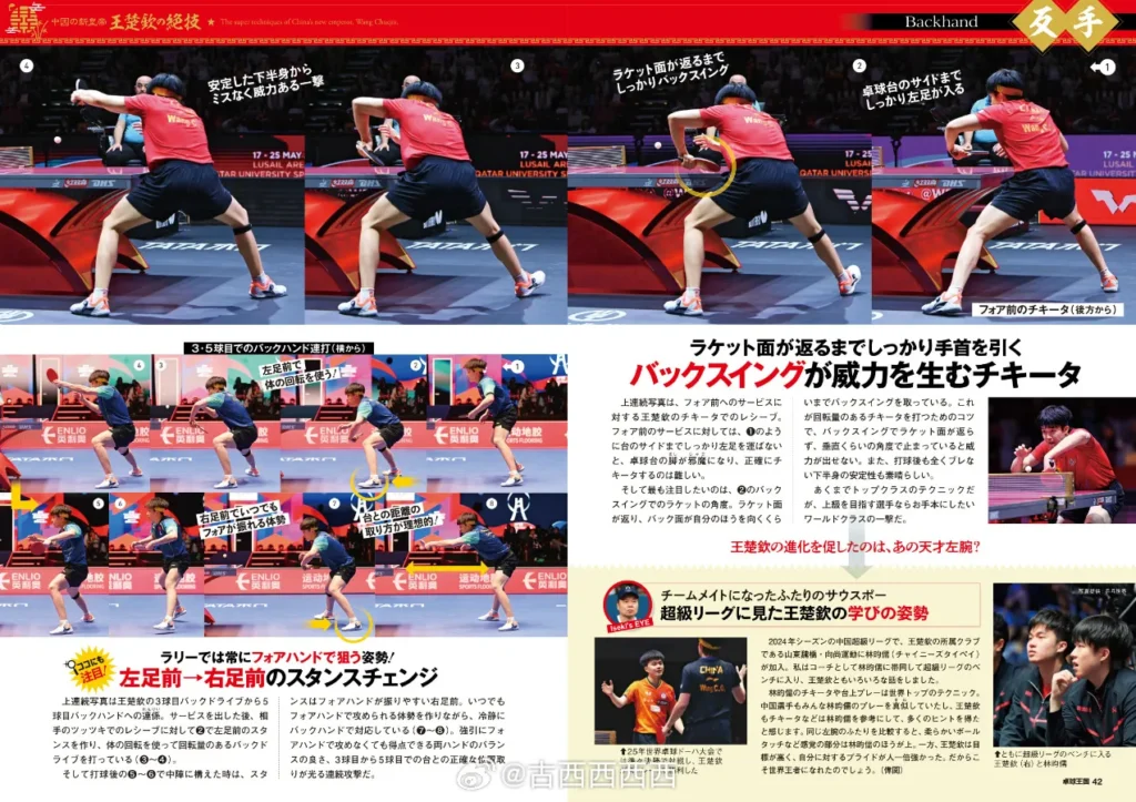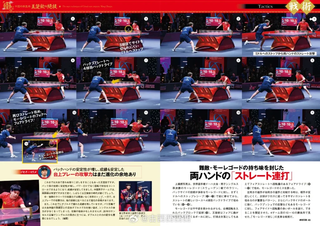 The photo sequence above is from the men’s singles semifinal against Sweden’s Truls Moregard at the Doha WTTC. Against Moregard, who has a wide range of backhand techniques, Wang Chuqin first played a drop shot to the middle (②-③) to draw him in close, then followed with a sharp down-the-line angle on the fourth-ball backhand drive (⑥-⑧).