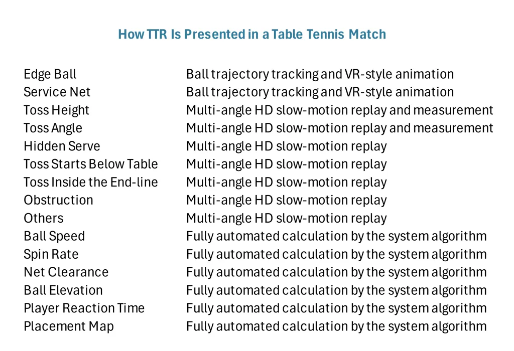 That’s why TTR couldn’t just copy the tennis version of Hawk-Eye. In table tennis, the serving is not just the start of a rally. It’s a weapon of control and psychological pressure. A good serve can win points outright and decide a game. So all serve-related details, including toss angle, toss height, and whether the ball was visible during the tossing, matter enough to be needed to be captured by the officiating system.