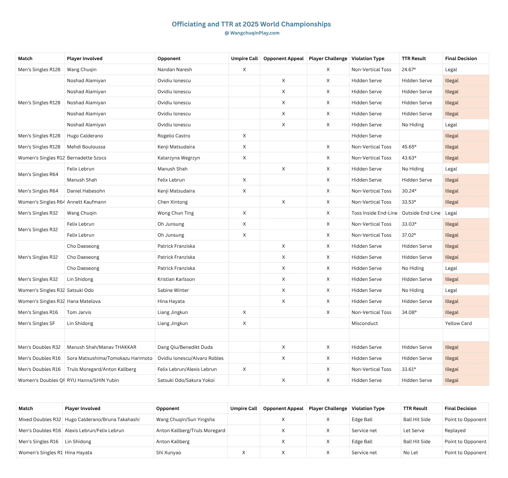 At WTTC, Wang Chuqin was called twice for his service. In the men’s singles R128, the umpire ruled his toss angle illegal, but TTR confirmed it was 24.67°, within the 30° limit. In the R32, he was called for tossing the ball inside the end-line, but TTR showed the toss was outside. Both challenges were successful and were the only ones that overturned umpire decisions at the tournament. Quick, clear, and confident.