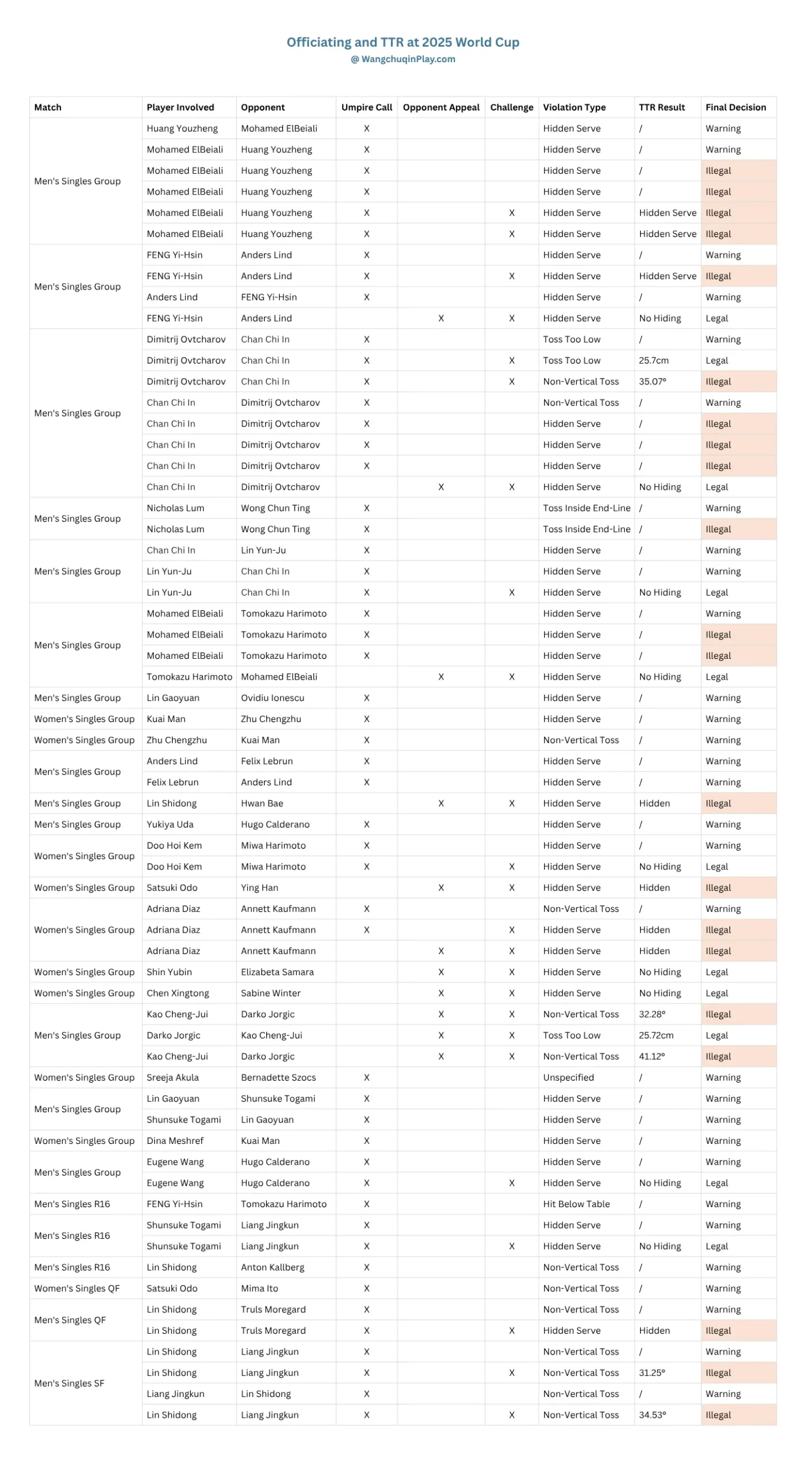 By the time the WTTC came around, the patterns had shifted. Umpires made just 11 serve calls in total, and 10 were challenged. Only 2 were overturned, while 9 were upheld. There was also a yellow card issued for misconduct.