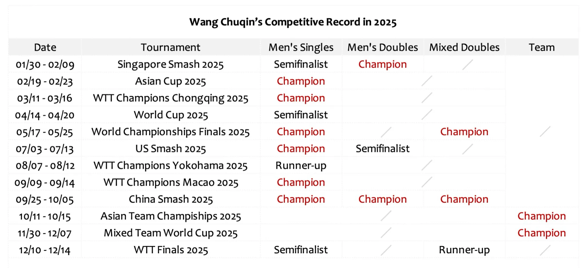 By the time the year-end event arrived, Wang walked into the Finals carrying a weight few players could sustain. In 11 international tournaments in 2025, he had played 120 matches and collected 12 titles across multiple events, including his first men’s singles world championship. China’s domestic competitions weren’t even counted here.