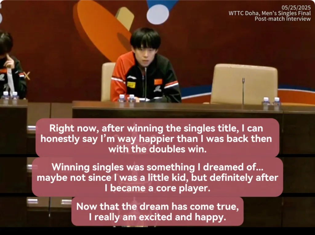 Even now, as the leading core player and the backbone of Chinese men’s table tennis, and the only player holding various World Championships titles and Olympic golds across events, Wang is still expected to carry all three. Nothing has changed, as if endurance itself were proof of greatness.